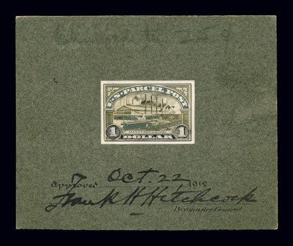 1482 E Q12-E1 image#Q12-E1, $1.00 Parcel Post, designer's model, essay of the design for the 25c consisting of a photo of a wash drawing showing factories as adopted for that value, with the "1" numerals and "Dollar" painted in with black ink and white wash, also touched up with wash in the vignette area, mounted on thick grey card measuring 104x86mm, hand inscribed and signed at bottom "Approved Oct. 12, 1912/Frank H. Hitchcock/Postmaster General", very fine; a unique essay that was proposed but approved for another value; C.A. Huston, designer. (Image) $2,500.00