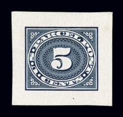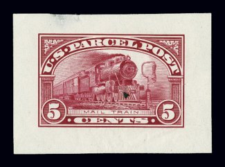 1485 P Q5P1 image#Q5P1, 5c Parcel Post, large die on India, off card and reduced to about 47x33mm, thin in the margin and small hole in the design very fine appearance and rare proof; C.A Huston, designer; C.M. Chalmers; vignette engraver. (Image) $1,400.00