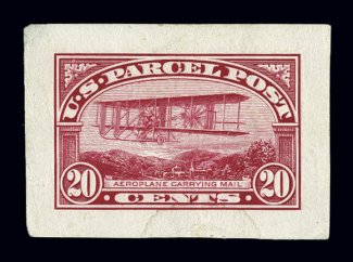 1486 P Q8P1 image#Q8P1, 20c Parcel Post, large die proof on India, die sunk on full size card measuring 202x154mm with untrimmed India proof paper, an attractive and extremely rare engraver signed die proof, inscribed and signed in pencil at bottom "Engraved by/H.L. Charlton/Bureau of Engraving & Printing", quite fresh with only slight edge wear causing slightly rounded corners, very fine and exceptionally choice; our records show that this is very likely the only known large die proof in private hands, (Image) $1,400.00+