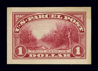 1487 P Q10P1 image#Q10P1, 50c Parcel Post, large die proof on India, die sunk on full size card measuring 201x153mm with untrimmed India proof paper, an exceptionally rare engraver's proof, on the reverse is penciled "Baldwin", the vignette engraver, overall quite fresh with only some light stains at the very corners of the India, very fine and exceptionally choice; we are aware of no other large die proof of this value in private hands, other than the one on wove paper in the President F.D. Roosevelt set; C.A. Huston, designer; M.M. Baldwin, vignette engraver; control number 570609 (1913). (Image) $1,400.00