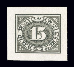 1491 E Q12a-E1-Q12g-E1 image#Q12a-E 1-Q12g-E1, 1c-15c Second Parcel Post issue, die proofs on India, the complete set of all seven values of which the dies were completed from the approved models in the above lot, these have the appearance of small die proofs measuring 27x29mm, all on original card backing and it is likely that these were originally made as large die proofs, all have bright strong colors as listed in Scott, very fine; ultimately this rejected design for Parcel Posts was adopted for the 1917 offset Documentary revenues; this is believed to be the only known set of these interesting printed essays according to Johl and others; an outstanding showpiece for a Parcel Post exhibit; ex-Johl, Southgate, Doolittle. (imagea) (imageb) (Image) $4,900.00