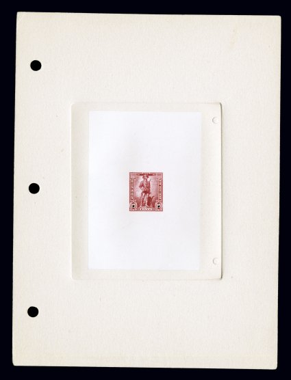 1496 TC TD28TC image#TD28TC, 1910 Minerva test stamp, engraved large die trial color proofs on India, five different colors, each die sunk on card measuring approximately 118x132mm, plus a sixth black proof printed directly on similar slightly larger die sunk glazed card, these are of the completed design as used to produce the Minerva test stamps used by the Bureau of Engraving and Printing to test the Harris offset press, colors are carmine, blue, dark green, dark brown and dark violet brown, all are fresh and attractive, extremely fine; the test stamps printed by lithography are listed by Brazer as essays and now by Scott in the new Test Stamp section; these original engraved proofs are listed by neither and are very rare. (Image) Est. 7,500-10,000
