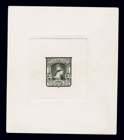 1495 TC TD28TC image#TD28TC, 1910 Minerva test stamp, engraved large die black proof, printed directly on die sunk glazed card measuring 123x140mm, the completed design as used to produce the Minerva test stamps used by the Bureau of Engraving and Printing to test the Harris offset press, a beautiful example of the engraving art, extremely fine; the test stamps printed by lithography are listed by Brazer as essays and now by Scott in the new Test Stamp section; this original engraved proof is unlisted and very rare. (Image) Est. 1,000-1,500