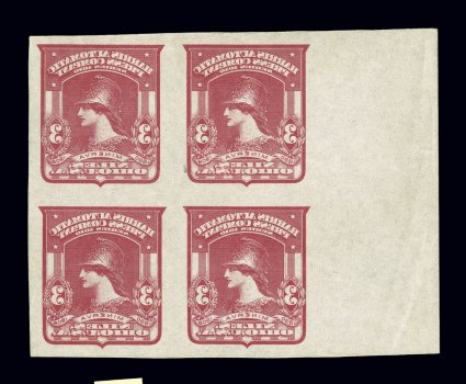 1499 ogbl TD29 image#TD29, 1910 Minerva reversed test stamp, similar to the above issue printed to test the Harris offset press, only the design is completely reversed with Minerva facing left, lovely large right sheet-margin block of four, without gum as issued, extremely fine and very scarce in such a select block of four. (Image) $2,600.00+