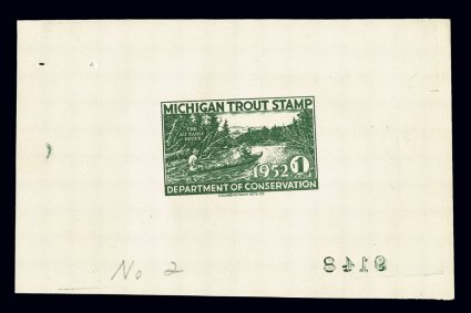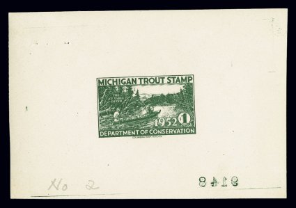 1501 P image1952 $1.00 Michigan Trout Stamp, die proof gummed wove paper, measuring 104x67mm showing the full die area, reversed 9148 number at bottom and marked in pencil "No. 2, produced by the Columbian Bank Note Co., o.g., n.h., staple holes at top left as usual, very fine. (Image) Est. 300-400