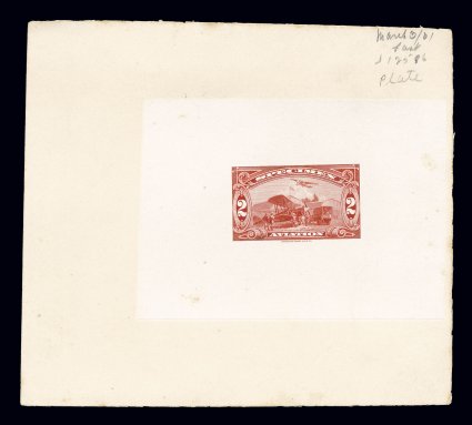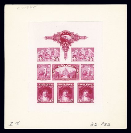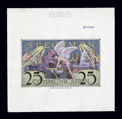 1503 E imageAmerican Bank Note Co. fabulous stamp specimen essay collection, this bank note company in the late 1920's to early 1930's was promoting to various countries around the world its ability to print stamps, to do this it developed seven different designs that were typical of stamps, one of which is an aviation design showing an airplane similar to air posts issued by Latin American countries, which were major customers of the A.B.N. Co., each design is given a denomination and the word "Specimen" is incorporated into the design, this marvelous assemblage contains original proofs in the development of these designs as well as later usages that were made of them by the company, we note seventeen different original die proofs, some of which may be the only ones in private hands, these are on India, either die sunk on cards or on "index" cards with company notes about the die, these original proofs include at least one or more of each of the seven designs, then a promotional book was developed with one of these seven designs being printed as a die proof on each page, three books are present, plus two sets of die proofs taken from booklets, in addition a composite sheet of eight images consisting of four of these designs was developed for salesman's books, there are ten different die proofs on India in different colors, die sunk on cards, as well as five different gummed sheets taken from a color chart that this composite was used for, each of these accompanied by 1989 PF certificates, there is even a full sheet of a plate proof on India on original card backing and two later die proofs in attractive multicolor renditions, one of which has been converted from engraved to typography, condition over all is quite clean and attractive, though the half dozen index card proofs were working items within the company and vary considerably in condition, very fine; this amazing assemblage of rare archival material paints a beautiful picture of the internal workings of the American Bank Note Co., contained here is virtually everything necessary to develop an award-winning gold medal single-frame exhibit of a this very fascinating area of philately. (imagea) (imageb) (Image) Est. 10,000-15,000