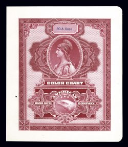 1504 E imageAmerican Bank Note Co. color charts, two leather bound booklets, each with engravings showing different colors that can be used to produce stamps and securities, the leather covers are gold stamped, one labeled "Color Chart for/Steel Engraved/Postage and Revenue Stamps" has 23 different gummed pages with eight specimen stamp images including Taj Mahal and Rembrandt, glassine interleaving between the pages, plus a few later issued stamps with "Specimen" overprints affixed to blank pages, the other, labeled "Color for Steel Securities" and dated 1916, has 26 beautifully engraved pages with an intricately framed engraving featuring a female allegorical figure and American Bank Note Company Eagle logo, all manner of engine turning designs are in the border to demonstrate their capabilities, one insect hole through the border of each page, not affecting the engraving, some wear to covers, an attractive and very fine representation of both colors and the art of engraved printing. (Image) Est. 1,500-2,000