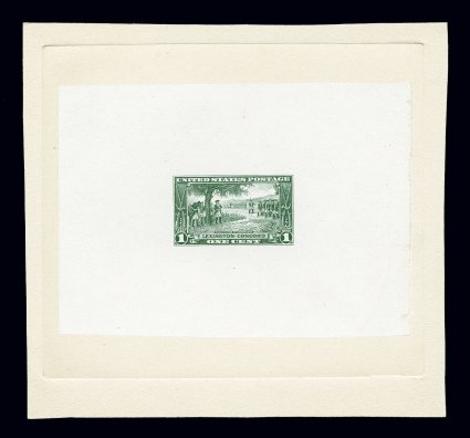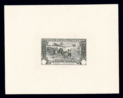 1081 E 617-E image#617-E, 1c Lexington-Concord, large die essay on India, in green, die sunk on card measuring 126x118mm, an incomplete engraving of the adopted design, lacks the strong shading in the foreground of the vignette which was considerably strengthened in the issued design, very fresh and clean, choice very fine; a rare essay that is quite likely unique, unlisted in Scott or Brazer; C.A. Huston, designer; Fred Pauling & L.S. Schofield, vignette engravers. (Image) Est. 1,500-2,000