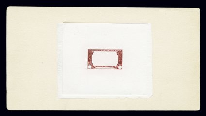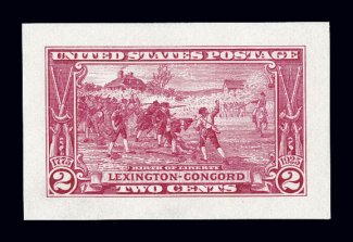 1082 E 618-E image#618-E, 2c Lexington-Concord, large die essay on India, in carmine, die sunk on card measuring 202x107mm with India untrimmed, an engraving of the adopted frame only, without vignette or value tablets, quite finished for the portion that is there, intense deep color, clean and attractive; choice very fine and an exceptionally handsome essay; probably unique and not listed by Scott or Brazer; C.A. Huston, designer; J.C. Benzing, Frame engraver; control number 1317765 (1925). (Image) Est. 1,500-2,000