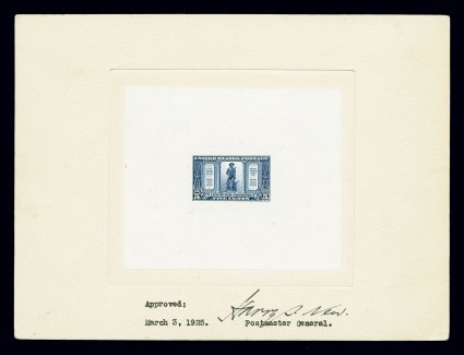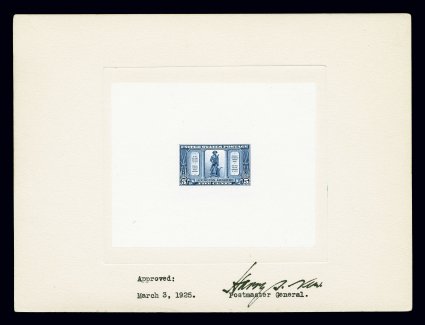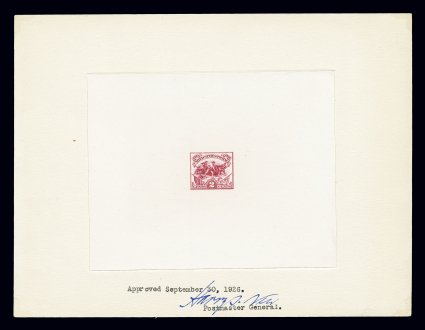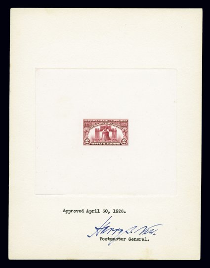 1093 P 627P1a image#627P1a, 2c Sesquicentennial Exposition, large die proof on wove paper, a choice approved large die proof, die sunk on full size card measuring 154x201mm, dated April 30, 1926 and signed by Harry S. New, Postmaster General, extremely fine; a rare large die proof; C.A. Huston, designer; John Eissler, vignette engraver; control number 1390710 (1926). (Image) $750.00