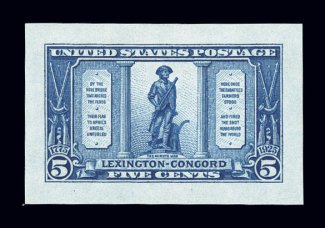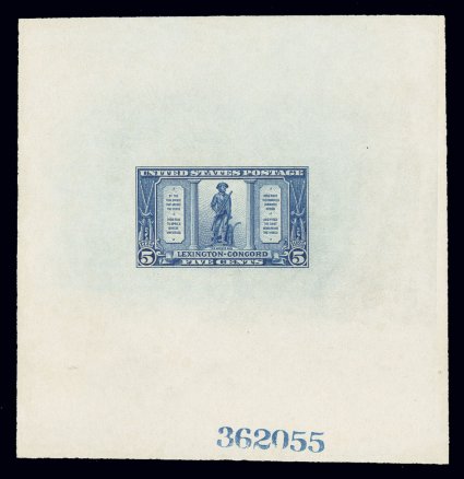 1088 P 617P1a-19P1a var. image#617P1a-19P1a var., 1c-5c Lexington-Concord, large die proofs on wove paper cplt., measuring 88-90x92-101mm being a large portion of the die area, the special set of large die proofs prepared for H.M. Southgate, characterized by not being card mounted and the control numbers positioned on the front, usually on the untrimmed non-die portion, though the 2c and 5c are at the bottom of the die area on this set, all are very fresh with clean paper and bright colors, extremely fine; only one set of proofs were issued in this manner making the Southgate set unique; C.A. Huston, designer; Fred Pauling & L.S. Schofield, vignette engraver 1c; L.S. Schofield, vignette engraver 2c; J.C. Benzing, vignette engraver 5c; control numbers 362043, 361927, 362055 respectively (1934); ex-Southgate. (Image) $2,100.00+