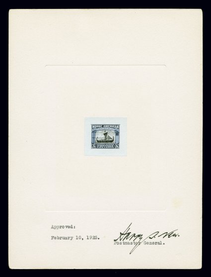 1090 P 620P1a-21P1a image#620P1a-21P1a, 2c and 5c Norse-Americans, large die proofs on wove paper cplt., a matched set of approved large die proofs, this being the set presented to President Calvin Coolidge, die sunk on full size cards measuring 202x152mm, each with typed approval dated February 17, 1925, and signed Harry S. New, Postmaster General, cards are fresh, trace of toning to the India of the 2c, very fine and choice; Harry New presented to President Coolidge a set of die proofs for all the stamps that were issued during the Harding-Coolidge presidencies, this set was part of that presentation; this set is without control numbers, which seems to happen occasionally on bicolor issues; C.A. Huston, designer; E.J. Hein, vignette engraver 2c; J.C. Benzing, vignette engraver 5c; ex-Coolidge. (Image) $1,700.00