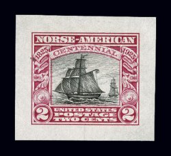 1091 P 620P2-21P2 image#620P2-21P2, 2c and 5c Norse-Americans, small die proofs on wove paper cplt., a matched set measuring 28x25mm, rich colors and detailed proof impressions, small black spot on 2c that barely shows to the front, very fine; all proofs of the Norse-American issue are rare, the small die proofs offered here are probably even rarer than their large die counterparts; C.A. Huston, designer; E.J. Hein, vignette engraver 2c; J.C. Benzing, vignette engraver 5c. (imagea) (Image) $1,700.00