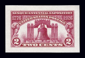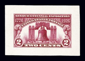 1094 P 627P2 image#627P2, 2c Sesquicentennial Exposition, small die proof on wove paper, nice balanced margins, measuring 43x28mm, very fresh and attractive, extremely fine; a very rare proof; C.A. Huston, designer; John Eissler, vignette engraver. (Image) $850.00