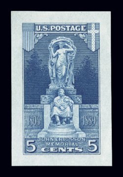 1096 TC 628TC2 image#628TC2, 5c Ericsson, small die proof on wove paper in dull blue, a very similar color to the Southgate proof in the previous lot, measuring 28x43mm with nice even margins, extremely fine; certainly a different color than the issued stamp and very rare, but it is unknown whether small die proofs even exist in the issued color; C.A. Huston, designer; L.S. Schofield, vignette engraver. (Image) $1,000.00