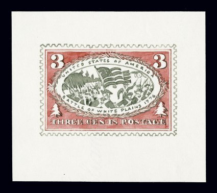 1099 P 629P1a image#629P1a, 2c White Plains, large die proof on wove paper, die sunk on full size card measuring 202x154mm, an attractive approved proof dated September 30, 1926 and signed by Harry S. New, Postmaster General, in pristine condition, extremely fine; a rare proof that quite likely only exists on wove paper; C.A. Huston, designer; John Eissler, vignette engraver; control number 11261 (1926). (Image) $750.00