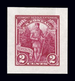 1104 P 643P2 image#643P2, 2c Vermont Sesquicentennial, small die proof on wove paper, measuring 26x28mm, large balanced margins, rich color and attractive, extremely fine; a very rare proof; C.A. Huston, designer; L.S. Schofield, vignette engraver. (Image) $850.00