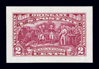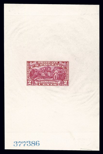 1107 P 644P1a var. image#644P1a var., 2c Burgoyne, large die proof on wove paper, measuring 82x126mm being a large portion of the die area with untrimmed overage at top and bottom, the special proof prepared for H.M. Southgate, characterized by not being card mounted and the control numbers applied to the front in the untrimmed non-die portion, fresh and very fine; a rare large die proof being the only one issued in this format; C.A. Huston, designer; L.S. Schofield, vignette engraver; control number 377386 (1934); ex-Southgate. (Image) $750.00+