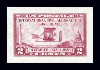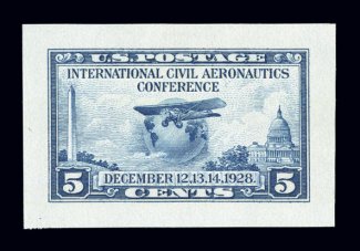 1112 P 649P1a-50P1a image#649P1a-50P1a, 2c-5c Aeronautics, large die proofs on wove paper, die sunk on full size cards measuring 202x152mm, a nicely matched set of approved proofs dated December 5, 1928 and each signed by Harry S. New, Postmaster General, this being the set presented to President Calvin Coolidge, each has a couple of very faint toning spots in the India, well away from the design, very fine; Harry New presented to President Coolidge a set of die proofs for all the stamps that were issued during the Harding-Coolidge presidencies, this set was part of that presentation; a rare and desirable set of air post related proofs; despite the premium assigned to large die proofs on India, it is our opinion that this set only comes on wove paper, this and the set offered in the next lot were both previously described in the auction catalogs when Mr. Livingston purchased them as being on India, with the $2,500.00 catalog value quoted and he paid that full catalog for each, however both sets are on wove and it is doubtful that they even exist on India paper; C.A. Huston & A.R. Meissner, designers 2c; C.A, Huston, designer 5c; J. Benzing & L.S. Schofield, vignette engravers 2c; L.S. Schofield, vignette engraver 5c, control number 146698, 146709 respectively (1928); ex-Coolidge. (Image) $1,800.00