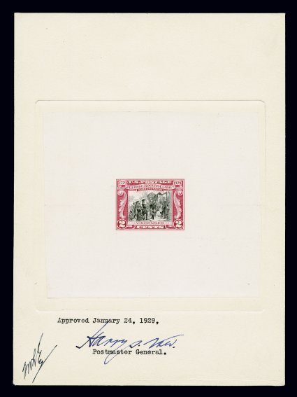 1116 P 651P1a image#651P1a, 2c George Rogers Clark, large die proof on wove paper, die sunk on full size card measuring 153x203mm, another approved proof dated January 24, 1929 and signed by Harry S. New, Postmaster General, trace of toning at the extreme right edge of India; choice very fine; C.A. Huston, designer; L.S. Schofield, vignette engraver; control numbers 154705, 154854 (1929). (Image) $800.00
