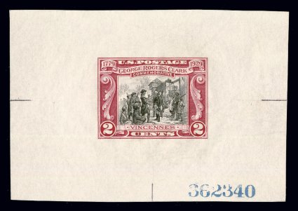 1117 P 651P1a image#651P1a var., 2c George Rogers Clark, large die proof on wove paper, measuring 94x65mm being a large portion of the die area, the special proof prepared for H.M. Southgate, characterized by not being card mounted and the control numbers applied to the front, in this case at the bottom in the die area, very fine and attractive; a rare large die proof being the only one in this format in public hands; C.A. Huston, designer; L.S. Schofield, vignette engraver; control number 362340 (1934); ex-Southgate. (Image) $800.00