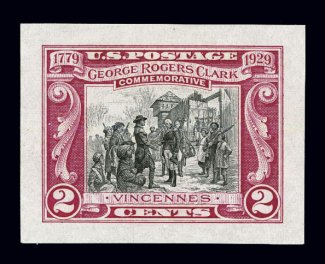1115 P 651P1a image#651P1a, 2c George Rogers Clark, large die proof on wove paper, die sunk on large card measuring 147x201mm, an approved proof dated January 24, 1929 and signed by Harry S. New, Postmaster General, extremely fine; a rare proof and an exceptionally attractive bicolor issue; it is quite likely that large die proofs of this issue only exist on wove paper; C.A. Huston, designer; L.S. Schofield, vignette engraver; control numbers 154715, 154842 (1929); ex-Lilly, (Image) $800.00