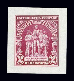 1121 P 680P2 image#680P2, 2c Battle of Fallen Timbers, small die proof on wove paper; measuring 25x28mm, pristine with strong color and nice even margins, extremely fine; a very rare proof; C.A. Huston, designer; L.S. Schofield, vignette engraver; ex-Lilly. (Image) $750.00