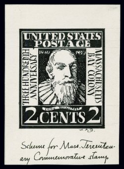 1126 E 682-E image#682-E 2c Massachusetts Bay Colony, artist's drawing of proposed design, ink drawing of entire design on card measuring 83x117mm, featuring a portrait of John Winthrop, founder of the second European settlement in America, designed by W.A. Dwiggins, very fine; little is known of this essay which is unlisted by Scott, listed in Brazer as unique. (Image) Est. 750-1,000