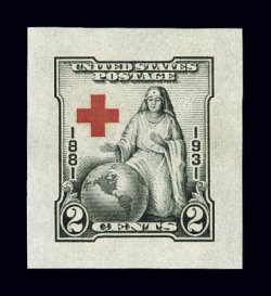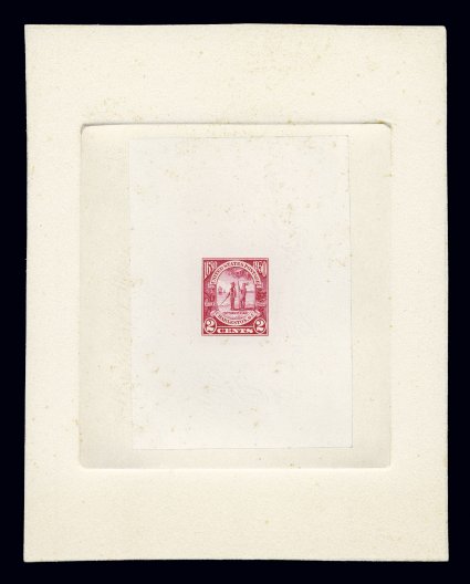1136 P 702P1a image#702P1a var., 2c Red Cross, large die proof on wove paper, the India of this proof shows all the registration marks and measures 78x88mm being a large portion of the die area, this is the special proof prepared for H.M. Southgate, usually these are characterized by not being card mounted, this is the only one we have seen that is with card measuring 152x203mm, we know that it is the Southgate proof because the control number is applied to the front at the bottom of the India, though it may have been mounted on the card later, very attractive and very fine; a rare large die proof being the only one prepared for H.M. Southgate; C.A. Huston, designer; John Eissler, vignette engraver; control number 362651(1934); 1990 PF certificate: ex-Southgate, Brazer. (Image) $900.00