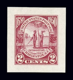1128 P 683P1a image#683P1a, 2c Carolina-Charleston, large die proof on wove paper, die sunk on large card measuring 121x153mm with full die sinkage, an unusual proof of which the provenance is not known, light flecks of toning affecting the wove proof paper, very fine and very rare; it is probable that large die proofs of this issue are only found on wove paper; C.A. Huston & A.R. Meissner, designers; J.C. Benzing, vignette engraver; control number 767307A (1943). (Image) $800.00
