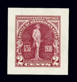 1130 P 688P2 image#688P2, 2c Braddock's Field, small die proof on wove paper, measuring 25x28mm, nicely margined with intense deep color being very fresh; extremely fine and very rare; A.R. Meissner, designer; John Eissler, vignette engraver. (Image) $750.00