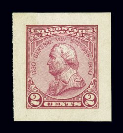 1131 P 689P2 image#689P2, 2c Von Steuben, small die proof on wove paper that is slightly different and being on a bit more yellowish wove paper than most of the small die proofs we have seen, measuring 26x28mm, fresh and attractive with nice even margins and bright color; extremely fine and very rare; A.R. Meissner, designer; L.S. Schofield, vignette engraver. (Image) $750.00