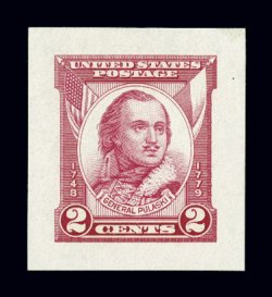 1133 P 690P1a image#690P1a, 2c Pulaski, large die proof on wove paper, die sunk on full size card measuring 202x153mm, this being from the special large die proofs prepared for President F.D. Roosevelt, exceptionally fresh and clean, trivial corner crease to card at top right, extremely fine; "From the Franklin D. Roosevelt Collection/ Auctioned Feb., April, 1945 by H.R. Harmer Inc., N.Y." handstamp on the reverse; A.R. Meissner, designer; John Eissler, vignette engraver; control number 333947 (1933); ex-F.D. Roosevelt. (Image) $800.00