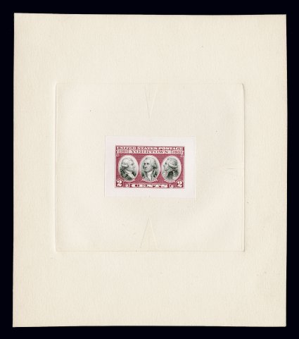 1138 P 703P1a image#703P1a, 2c Yorktown, large die proof on wove paper, die sunk on large card measuring 145x165mm, a most unusual proof from the Eissler collection with the wove proof paper largely cut away leaving the proof in the center about the size of a small die proof and small triangles with registration markers on all four sides, deep colors with the frame being in the lake shade, very fine; fresh and very fine; rare and unusual; C.A. Huston, designer; John Eissler, vignette engraver; control number 70016; ex-Eissler, Brazer. (Image) $800.00