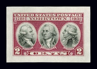1139 P 703P2 image#703P2, 2c Yorktown, small die proof on wove paper, measuring 43x29mm with nice balanced margins, fresh and bright proof, extremely fine; very rare and desirable; C.A. Huston, designer; John Eissler, vignette engraver. (Image) $750.00