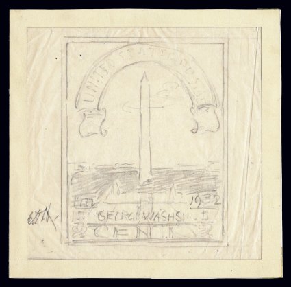 1140 E 704-E1 image#704-E1, 1/2c Washington Bicentennial, artist's preliminary sketch on tracing paper, an unadopted design showing the Washington Monument, by C.A. Huston, the long-time designer at the Bureau of Engraving and Printing, on tracing paper with a card and paper frame, initialed by the artist at left, very fine and unique. (Image) $750.00