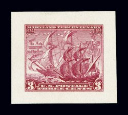 1161 P 736P2 image#736P2, 3c Maryland Tercentenary, small die proof on wove paper, measuring 30x26mm, brilliantly fresh with strong color, extremely fine and very rare; V.S. McCloskey, designer; J.C. Benzing, vignette engraver. (Image) $650.00