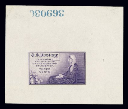 1163 P 737P1a image#737P1a var., 3c Mothers of America, large die proof on wove paper, measuring 76x63mm being a large portion of the die area, this is the special proof prepared for H.M. Southgate, characterized by not being card mounted and the control numbers applied to the front, in this case inverted at the top, fresh and very fine; a very rare large die proof being the only one issued in this format, and our records show that this is quite likely the last issue for which Southgate proofs were prepared; V.S. McCloskey, designer; J.C. Benzing, vignette engraver; control number 369030 (1934); ex-Southgate. (Image) $800.00
