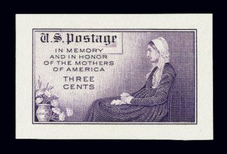 1162 P 737P1a image#737P1a, 3c Mothers of America, large die proof on wove paper, die sunk on large card measuring 195x141mm, an approved proof dated April 10, 1934 and signed by James A. Farley, Postmaster General, slight edge thinning to the top edge where apparently an overleaf had been removed or possibly bound, very fine; it is our opinion that large die proofs of this issue are only on wove paper; a very rare approved proof from this period; V.S. McCloskey, designer; J.C. Benzing, vignette engraver; control number 367571 (1934). (Image) $800.00
