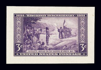 1165 P 739P2 image#739P2, 3c Wisconsin Tercentenary, small die proof on wove paper, measuring 44x28mm, an exceptionally attractive proof with intense violet color, extremely fine; V.S. McCloskey, designer; Carl T. Arlt, vignette engraver. (Image) $650.00