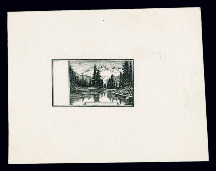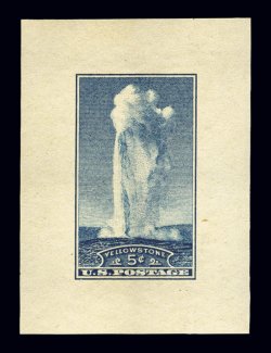 1171 P 746P1a image#746P1a, 7c National Parks, large die proof on wove paper, die sunk on large card measuring 120x152mm, showing the full die sinkage, an exceptionally handsome proof in pristine condition, extremely fine; only the 1c, 3c, 7c and 9c values from this popular series are listed in large die proofs in Scott (for 1c and 3c see lots XXX), an extremely rare proof and quite likely the only one known in public hands; V.S. McCloskey, designer; J.C. Benzing, vignette engraver. (Image) $800.00