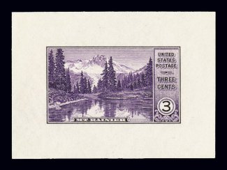 1168 P 742P1a image#742P1a, 3c National Parks, large die proof on wove paper, die sunk on large card measuring 152x120mm, showing the full die sinkage, a lovely fresh proof, trivial tiny abrasion to the card outside the die area at left, choice very fine; only the 1c, 3c, 7c and 9c values from this popular series are listed in large die proofs in Scott (for 1c and 7c see lots 1167 and 1171), an extremely rare proof and quite likely the only one known in public hands; V.S. McCloskey, designer; J.C. Benzing, vignette engraver. (Image) $800.00