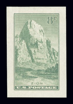 1169 P 742P1 var. image#742P1 var., 3c National Parks, large die proof on stiff white bond, a most unusual proof being fully gummed, much larger than the normal small dies, measuring 55x40mm, attractive, o.g., lightly hinged, very fine; unlisted in Scott; this and the 5c value in the next lot are the only examples that we have seen and very probably the only known example produced on this paper and gummed; V.S. McCloskey, designer; J.C. Benzing, vignette engraver. (Image) Est. 500-750