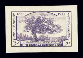 1173 P 772P2 image#772P2, 3c Connecticut Tercentenary, small die proof on wove paper, measuring 43x28mm, a very attractive proof in pristine condition, extremely fine and rare; V.S. McCloskey, designer; J.C. Benzing, vignette engraver. (Image) $650.00