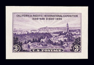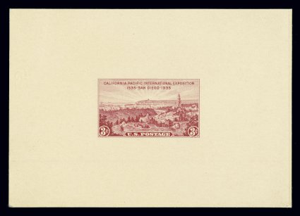 1175 P 773P2 image#773P2, 3c California Pacific Exposition, small die proof on wove paper, measuring 43x28mm, intense deep color and attractive, very fresh, extremely fine and rare; A.R. Meissner, designer; Carl T. Arlt, vignette engraver. (Image) $650.00