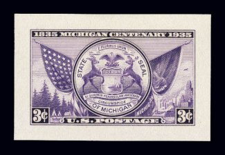 1177 P 775P2 image#775P2, 3c Michigan Centenary, small die proof on wove paper, measuring 43x28mm, a handsome proof in pristine condition, extremely fine and rare; A.R. Meissner, designer; L.C. Kauffmann, vignette engraver. (Image) $650.00