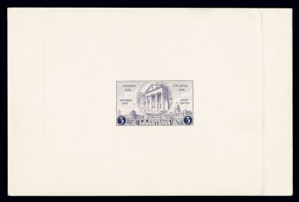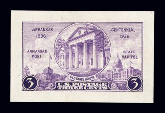 1179 P 782P1 var. image#782P1 var., 3c Arkansas Centennial, large die proof on white surface glazed card, measuring 135x89mm showing the full die sinkage, exceptionally fresh and attractive, Bureau handstamp on the reverse reads "Engraver's Stock Proof/Authorized by" and initialed, extremely fine; an exceptionally rare proof that is not listed by Scott in this form; very probably the only one known in public hands; A.R. Meissner, designer; Carl T. Arlt, vignette engraver; control number 468791 (1936). (Image) Est. 750-1,000