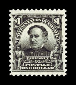262 nh 311 image#311, $1.00 Black, an exciting mint single that is not only impeccably well centered within lavishly large margins, but also possesses an incredible overall freshness, with striking "jet" black color and a particularly intense impression on immaculate white paper, the reverse sports pristine o.g. that has never been hinged, extremely fine in every regard; among the finest never hinged One Dollar 1902 Issue stamps we have ever offered; 1993 and 2002 PF certicates. (Image) $2,000.00