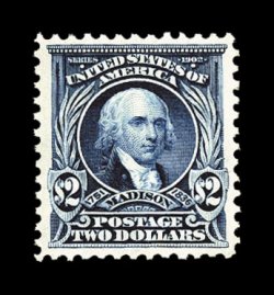263 nh 312 image#312, $2.00 Dark blue, a remarkably choice "post office" fresh mint single, possessing stunning prooflike color and impression on brilliantly white paper, in addition it is extraordinarily well centered amid uncharacteristically large margins, immaculate o.g. without a single bend or skip, n.h., extremely fine; a stamp for the collector who seeks out only premium quality never hinged stamps; 2005 PSE certificate (XF 90; SMQ $6,700.00). (Image) $3,000.00
