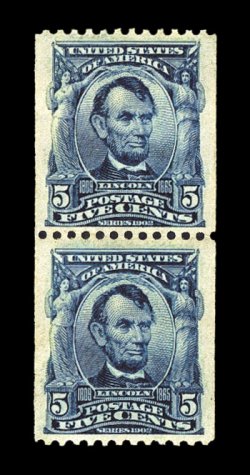 267 og 317 image#317, 5c Blue coil, perf. 12 horiz., a marvelously choice mint pair of this rare experimental coil, possessing exceptional overall centering that surpasses the vast majority of the fewer than 90 pairs that are recorded, remarkably deep color and impression, fresh clean o.g., lightly hinged, particularly the bottom stamp which shows hardly any trace of hinging at all, extremely fine; among the finest quality pairs available; 1967 and 2006 PF certificates; ex-Drucker. (Image) $17,500.00
